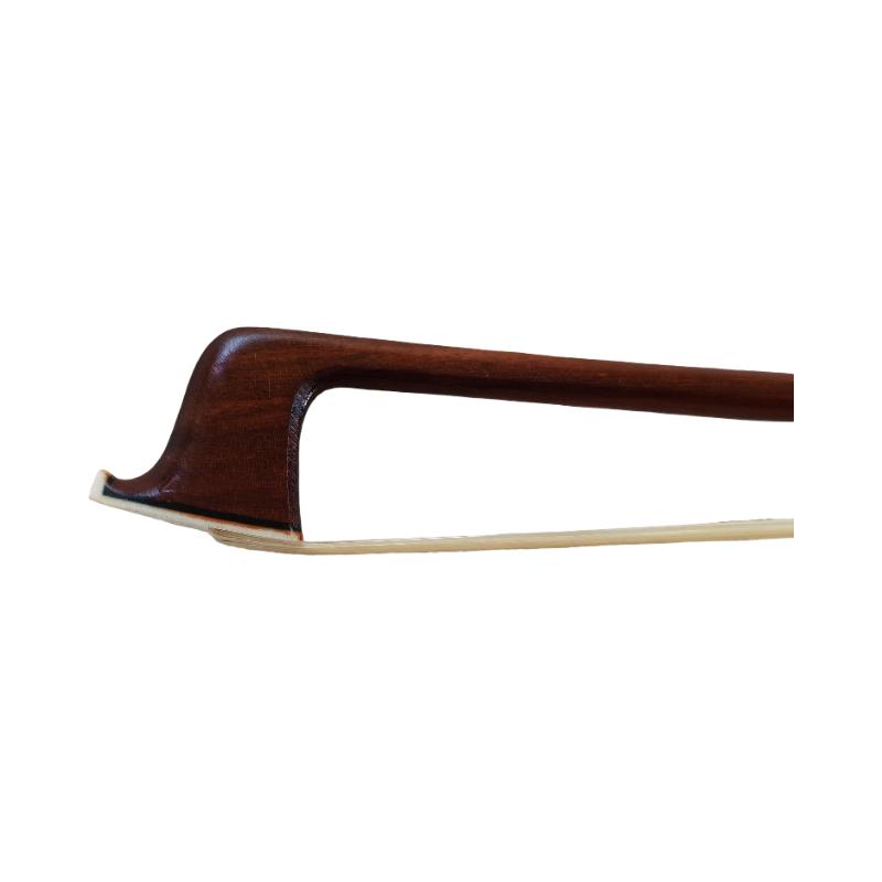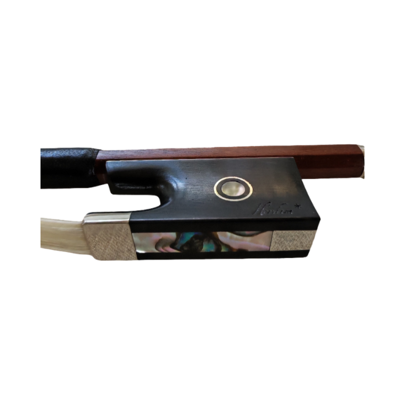 Stiff octagonal stick, brazilwood Nickel silver mounted Mongolian horse hair hank Fully lined ebony frog Parisian eye 3-part button Flamed abalone slide Outstanding bow for aspiring students, worked after traditional French pattern. Hand finished and varnished. High-grade wood selection, well seasoned, octagonal stick.