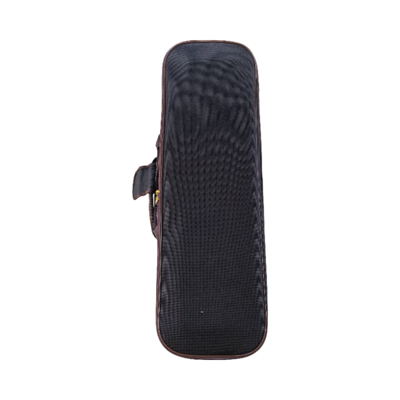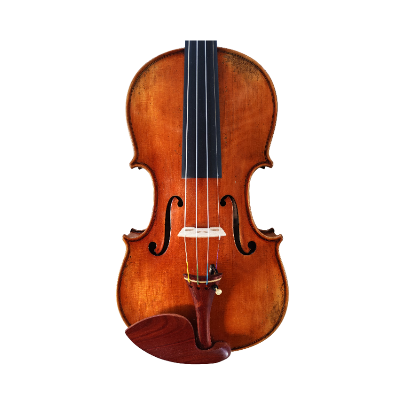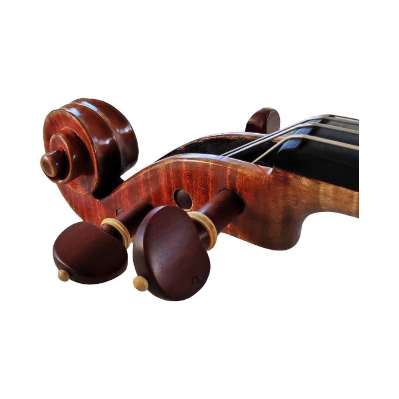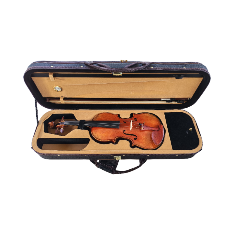 This 4/4 or full-size professional-level violin rivals trade instruments for virtuoso young students to adult professional musicians (normally 13 years and older, depending on their length). It was hand selected by our resident luthier and is the top of our imported line. It can be used for solo performances and features a hand applied and antiqued oil varnish, wood that has been aged for 18 years or more that provides a rich, penetrating sound ideal for the serious career musician. The pegs, tailpiece and fingerboards are solid ebony. It comes standard in a luxurious dark/brown/burgundy case with luxury finishes and a sturdy canvas covering.